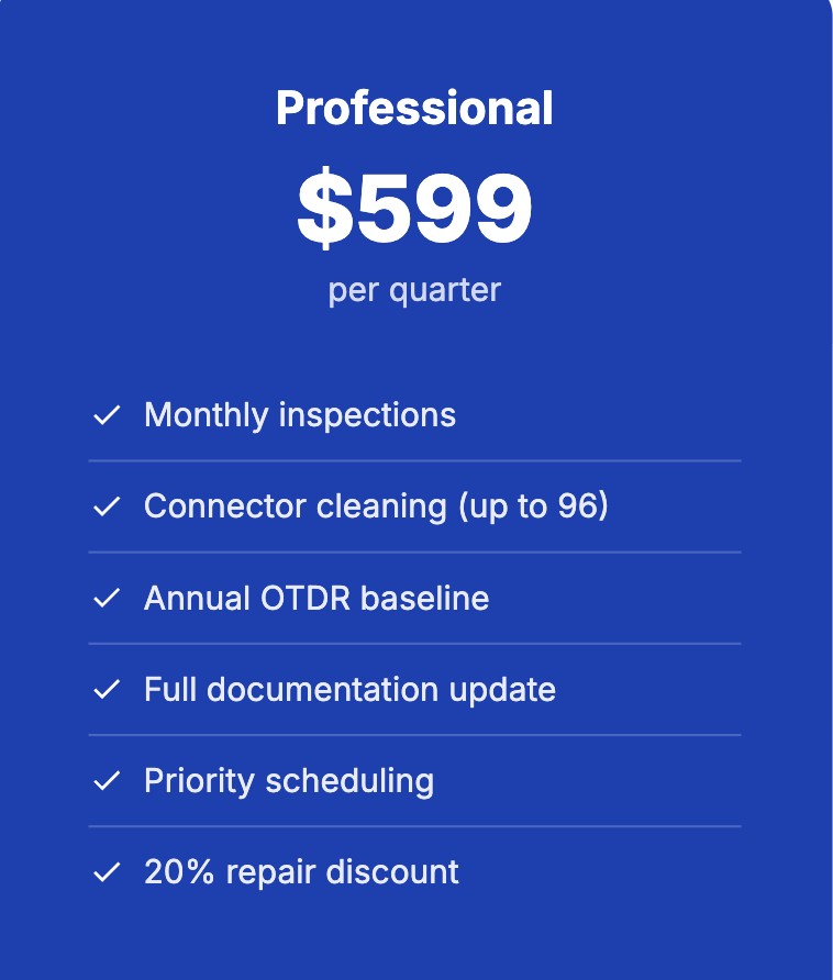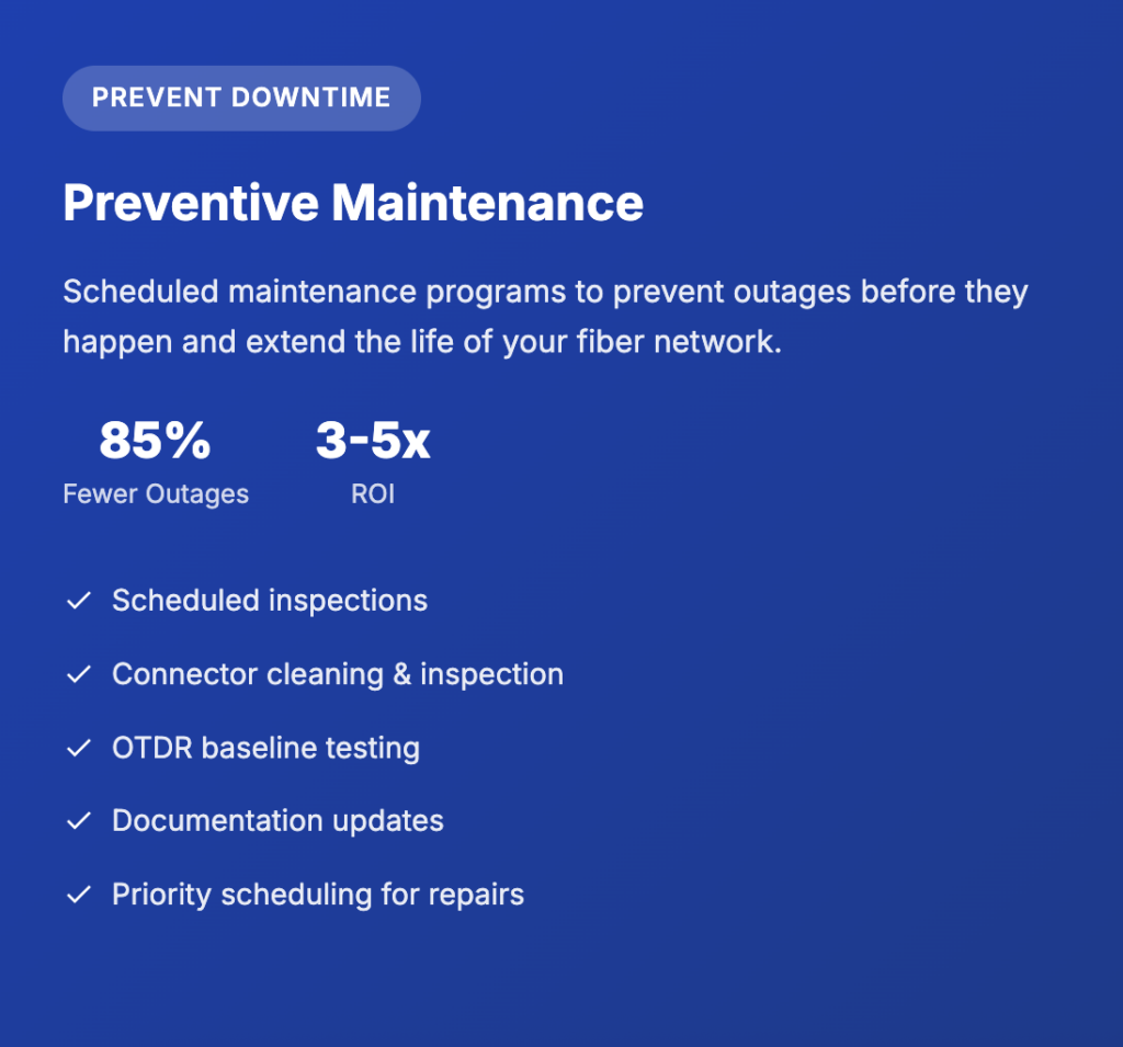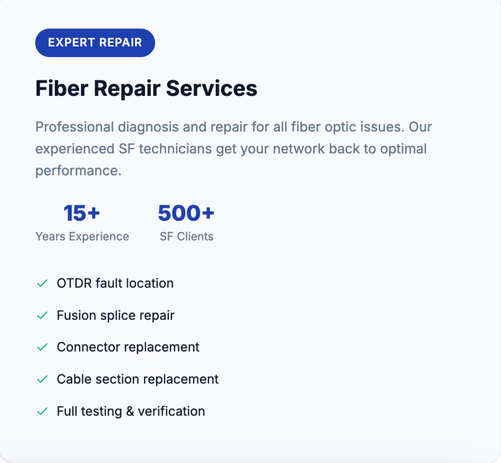 Proactive maintenance and expert repair services to keep your SF fiber network running at peak performance. Prevent costly downtime with scheduled maintenance programs.