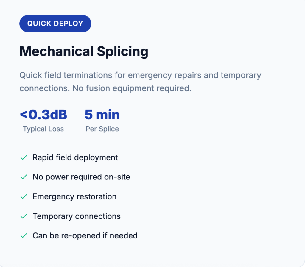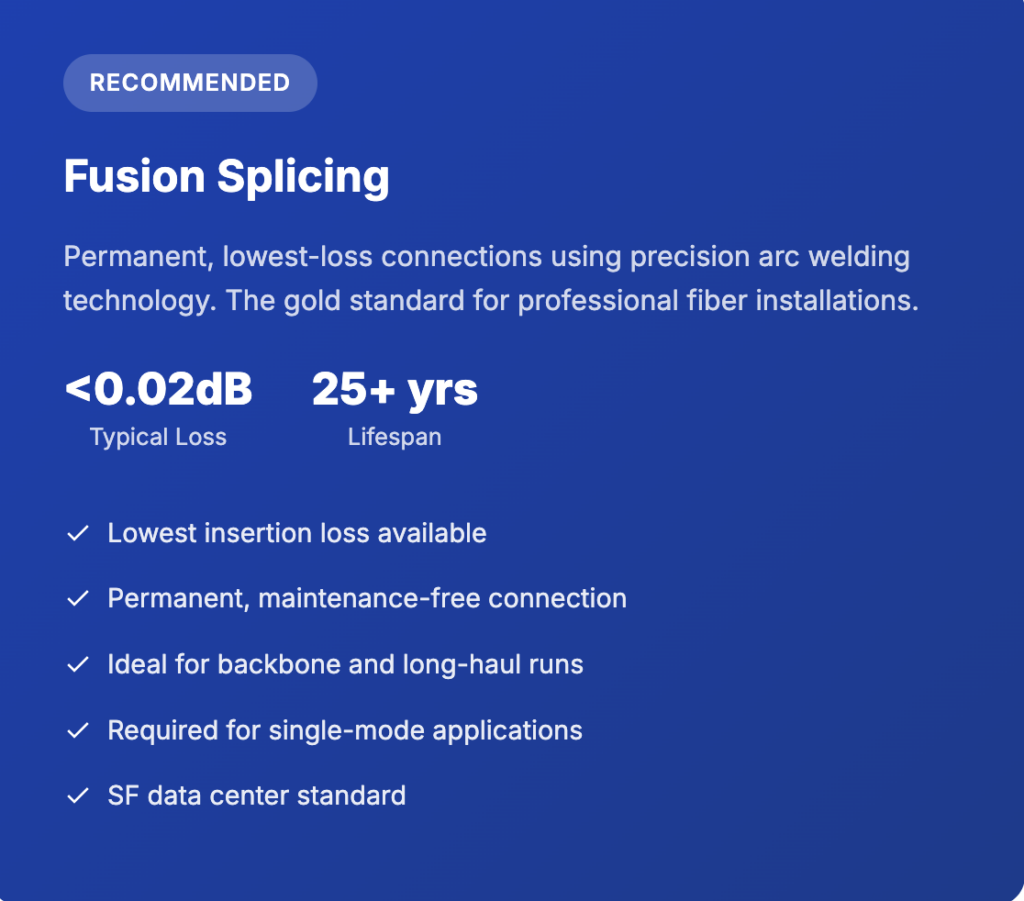 Expert fiber termination services using industry-leading equipment. We deliver precision connections that maximize signal integrity and minimize loss for SF businesses.
